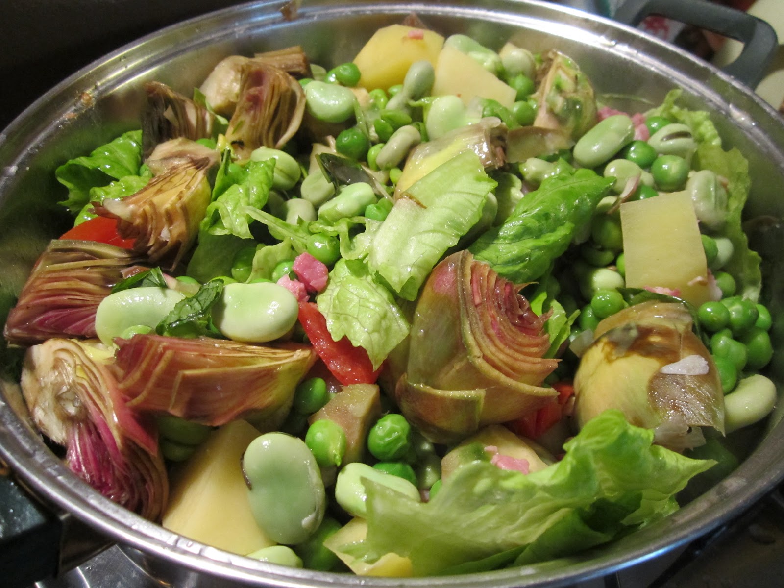 Cuocere tutto con 4 bicchieri d'acqua, a fine cottura inserire in un nido tra la verdura 1 uovo a persona e lasciarlo cuocere circa 7 o 8 min
